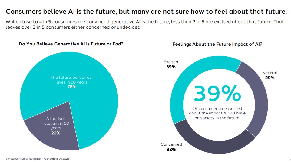 One study by Dentsu revealed that while nearly 4 in 5 people believe generative AI is the future, less than 2 in 5 are actually excited about it, leaving the majority of consumers either skeptical or outright concerned about what that future looks like.