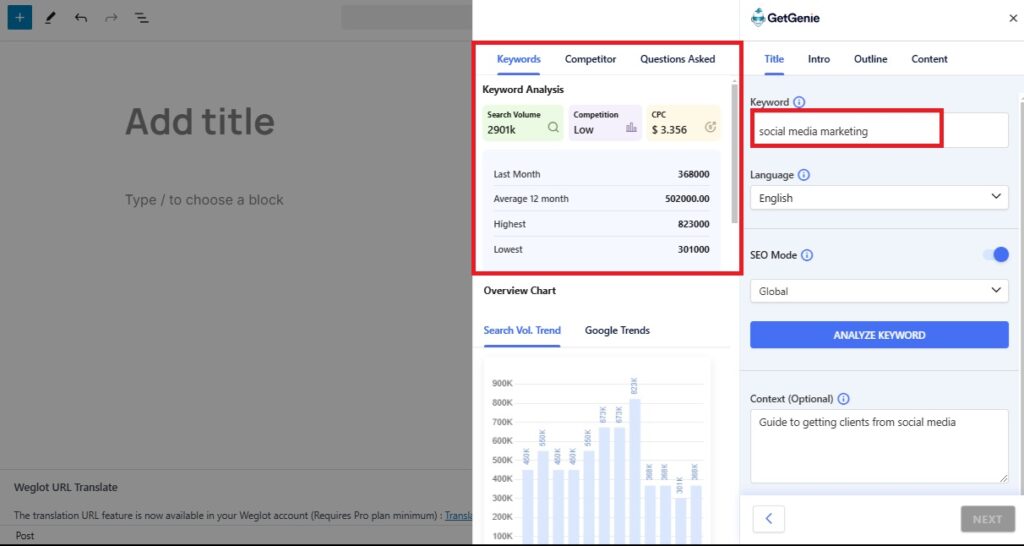 Connect it to your WordPress site, and you can run keyword analysis directly from within the post editor before using the same tool to generate a title, outline, and even the first draft of your post.
