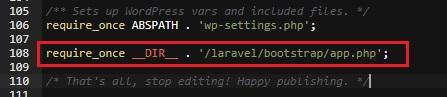 By doing this, you’re loading the app.php bootstrap file, establishing a connection between the two tools so that you can now take advantage of Laravel’s routing, database management, and other features directly from within WordPress.